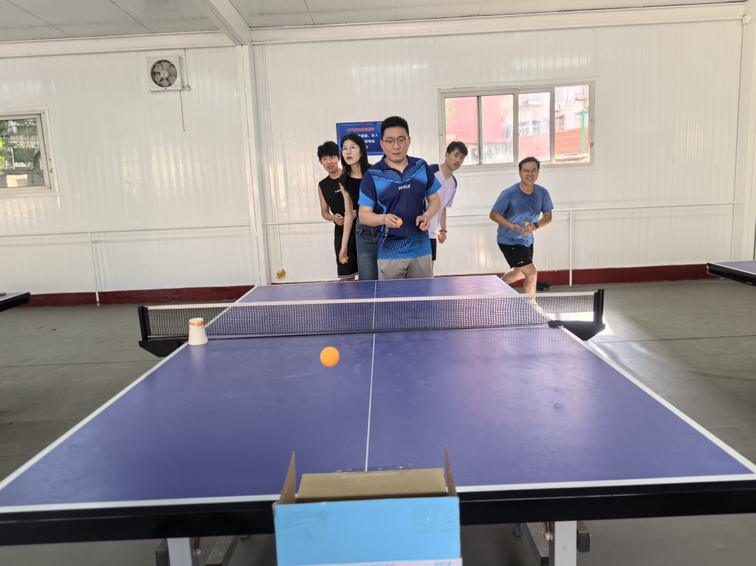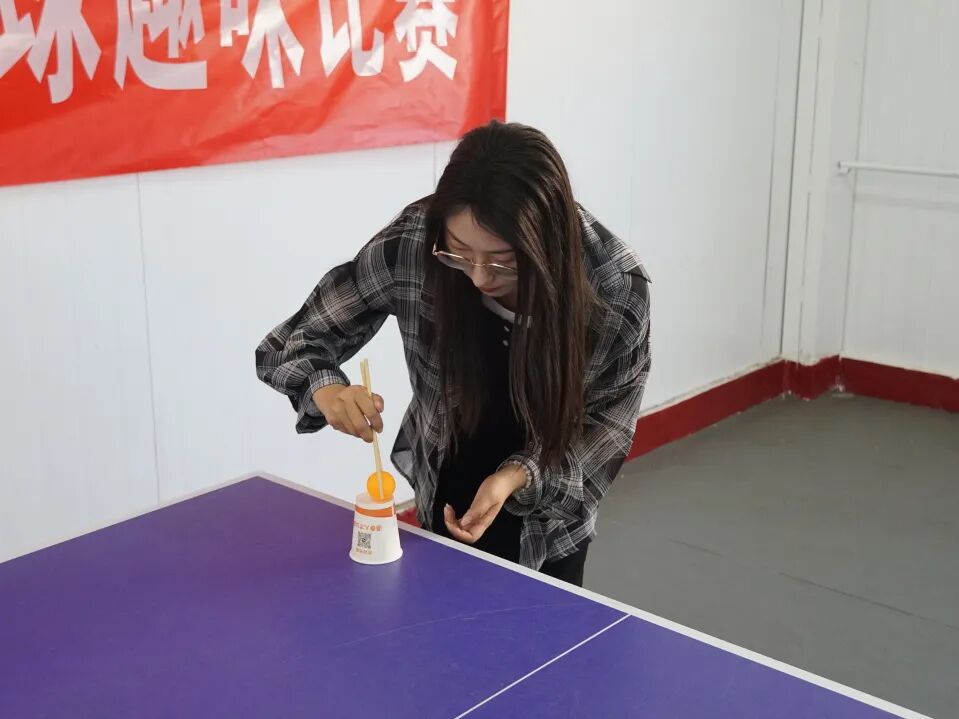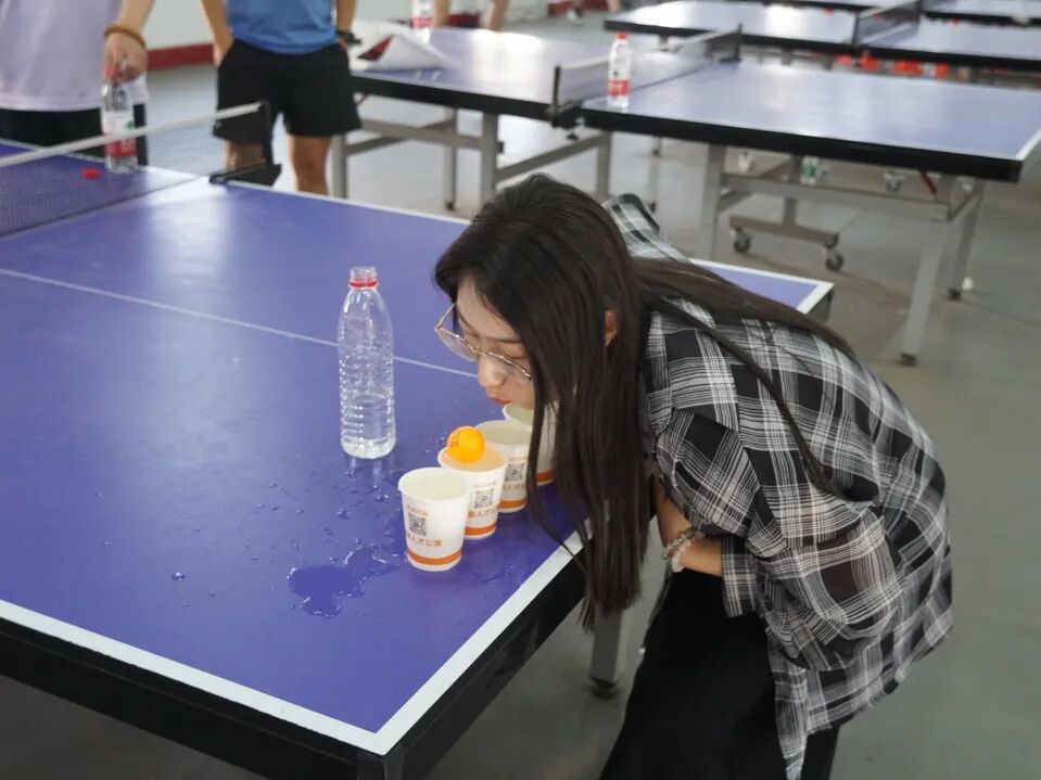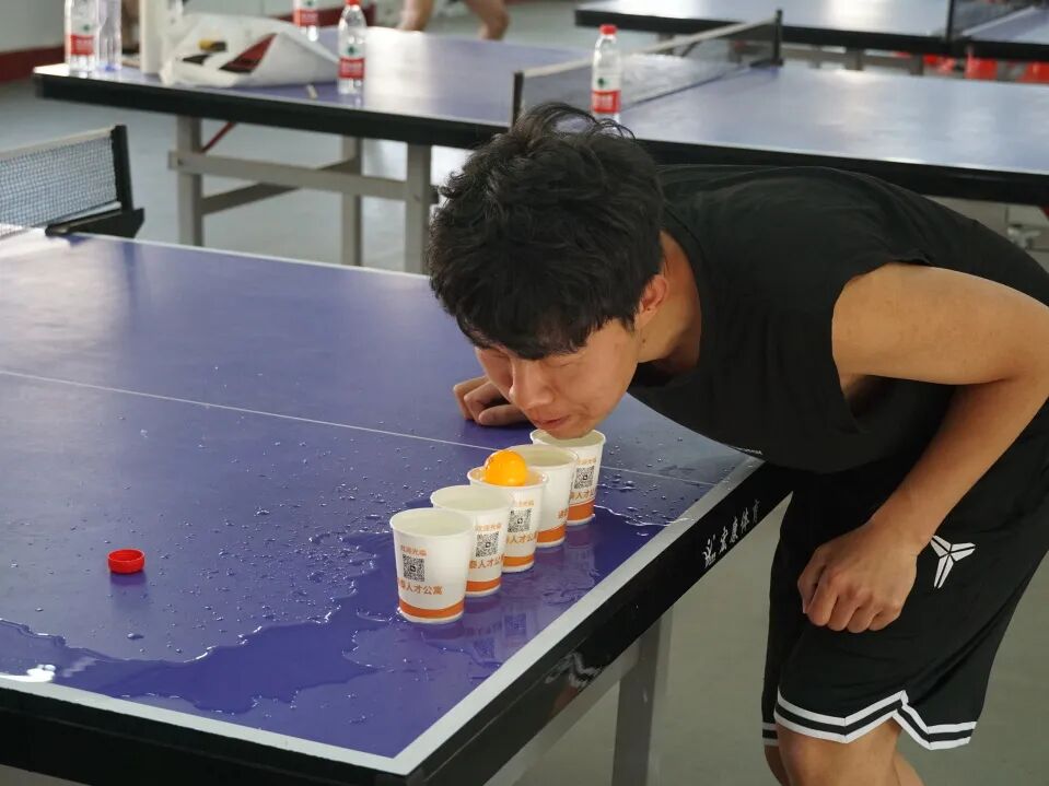 此次比赛不仅有激烈的竞技对抗,还设置了“趣味乒乓”游戏环节,参赛选手们被分为两组进行游戏。首先是“乒乓弹弹弹”,各组队员们屏气凝神,站在乒乓球桌的一侧试图将球精准弹入另一侧的纸盒中。
